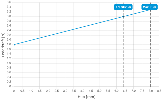 - Beim Auftreffen auf die Prüfoberfläche steht eine bis zu 100% höhere Federkraft zur Verfügung, im Arbeitshub jedoch die gleiche Federkraft wie ein Standard-GKS.