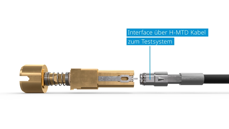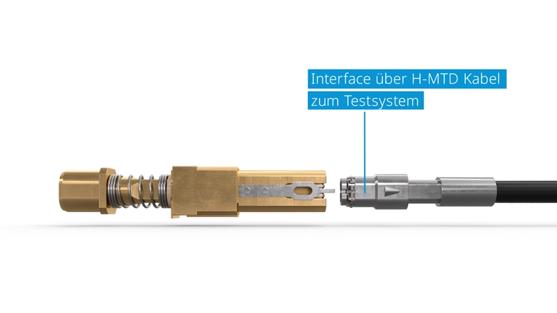 Die Verbindung zum Testsystem erfolgt über standardisierte H-MTD Kabel, was Ihnen eine einfache und sichere Integration in bestehende Prüfaufbauten gewährleistet.
