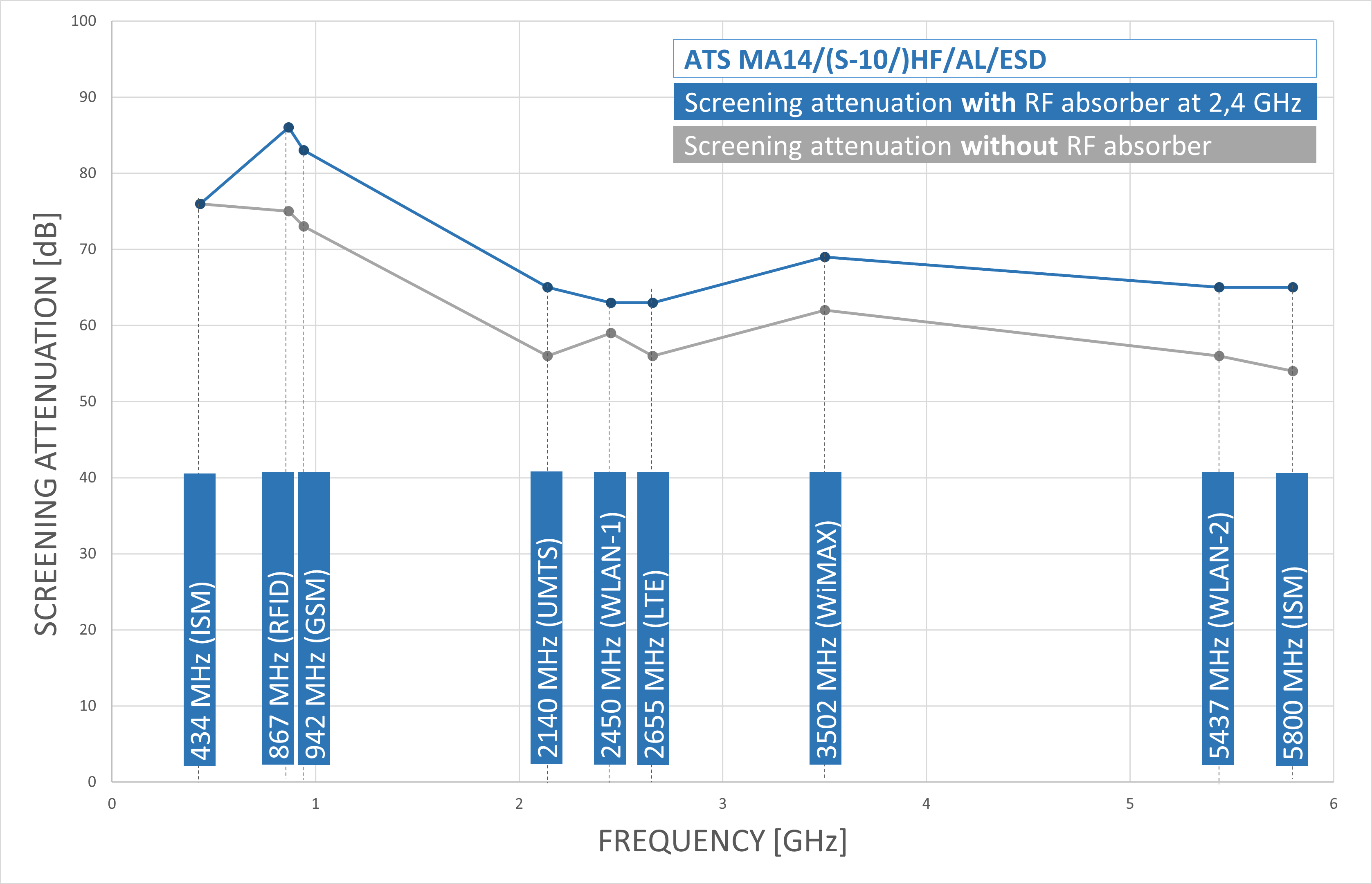 - Outstanding shielding attenuation > 60 dB in the frequency range up to 6 GHz