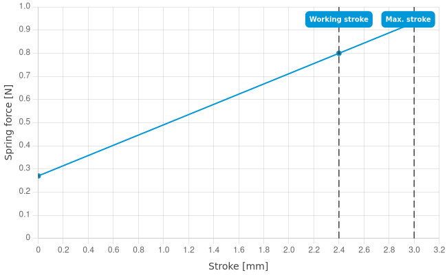 • Spring force at working stroke: 0.8 N [2.87 ozf]