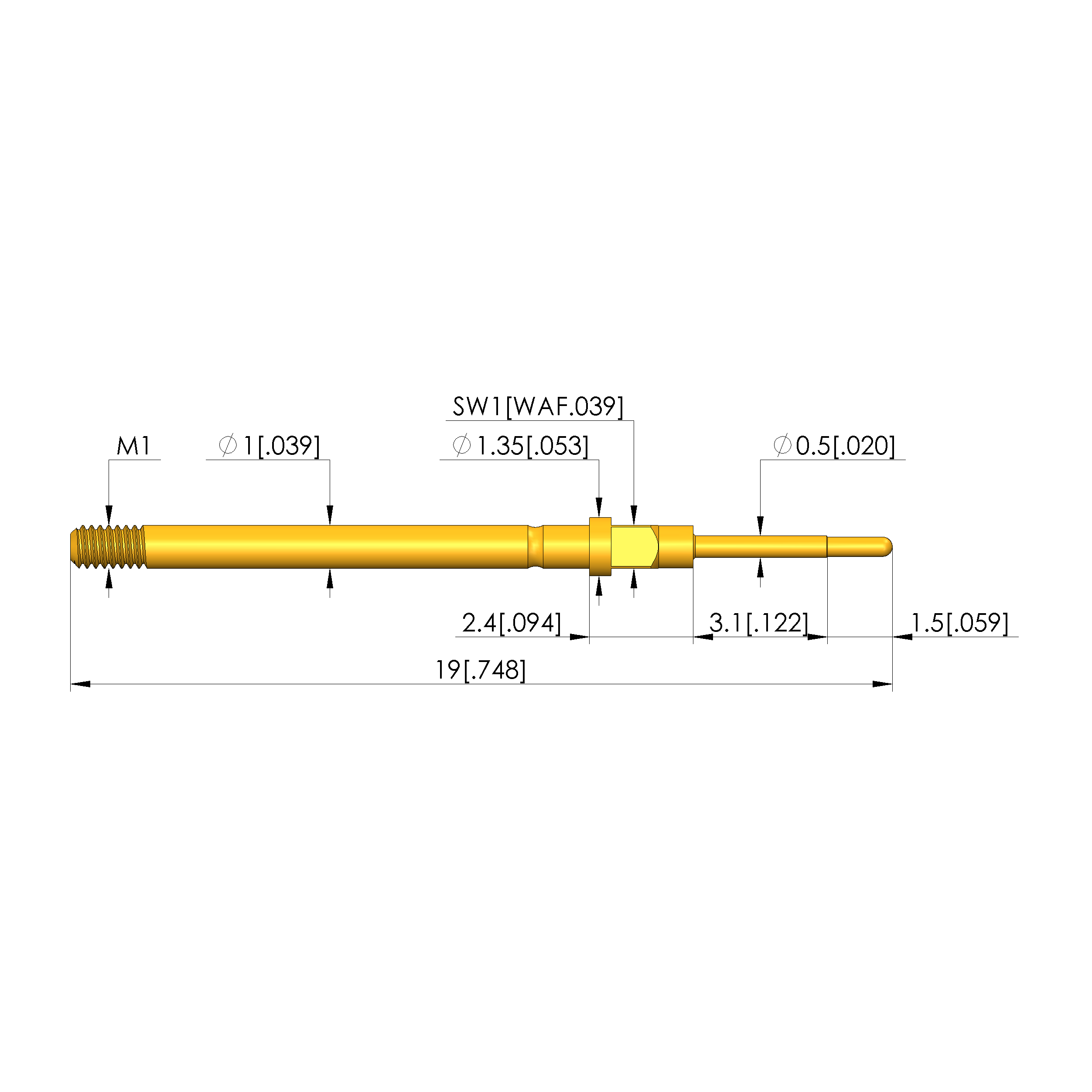 - Total length: 19 mm [.748 in]