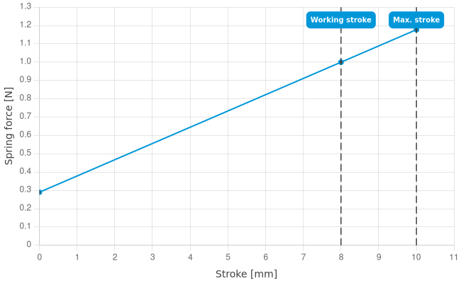 - Spring force at working stroke: 1 N [3.59 ozf]