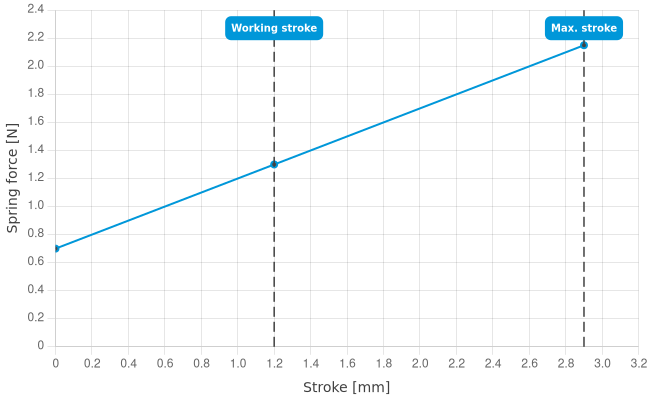 - Spring force at working stroke: 1.3 N [4.67 ozf]