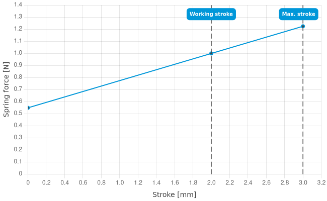- Spring force at working stroke: 1 N [3.59 ozf]