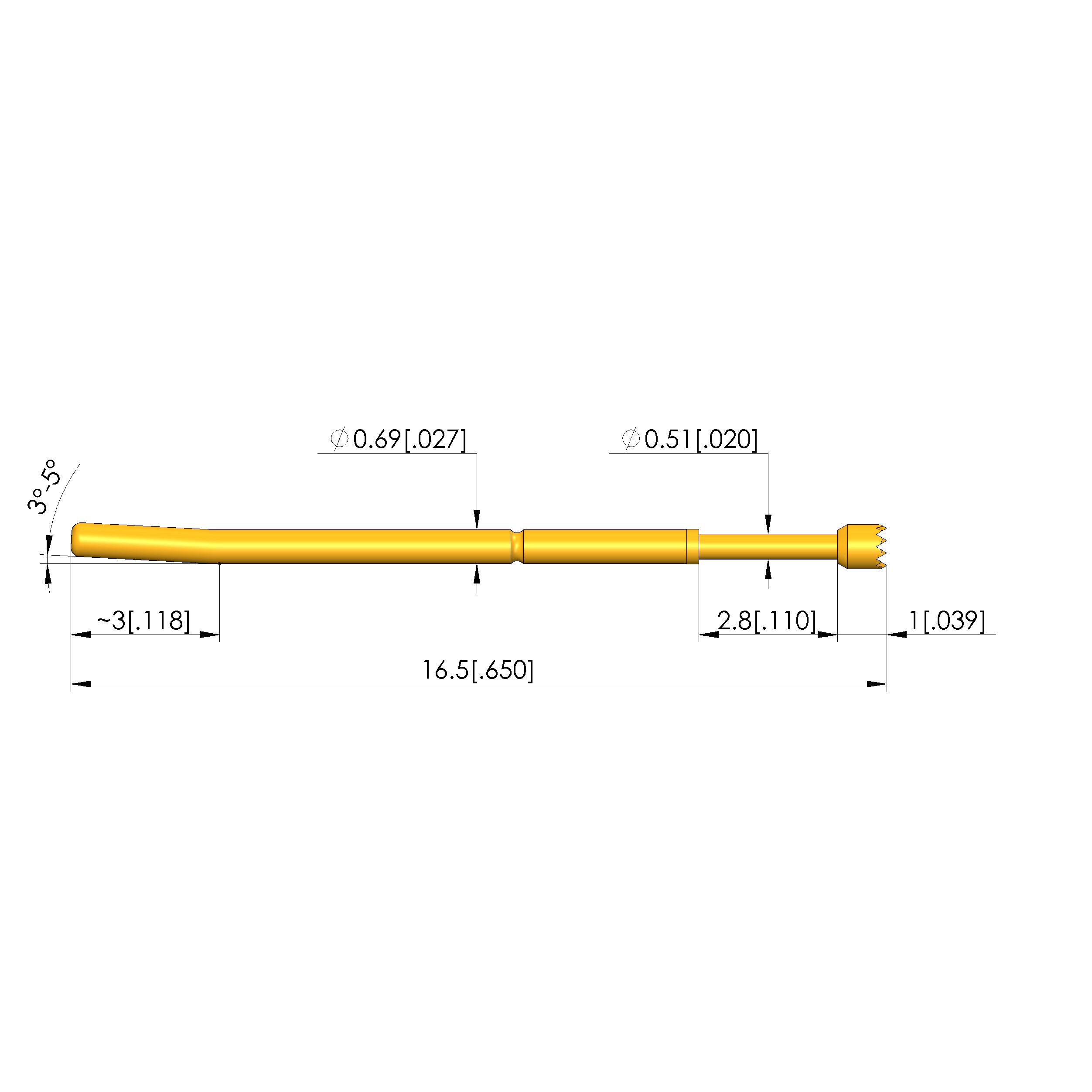 - Total length: 16.5 mm [.649 in]