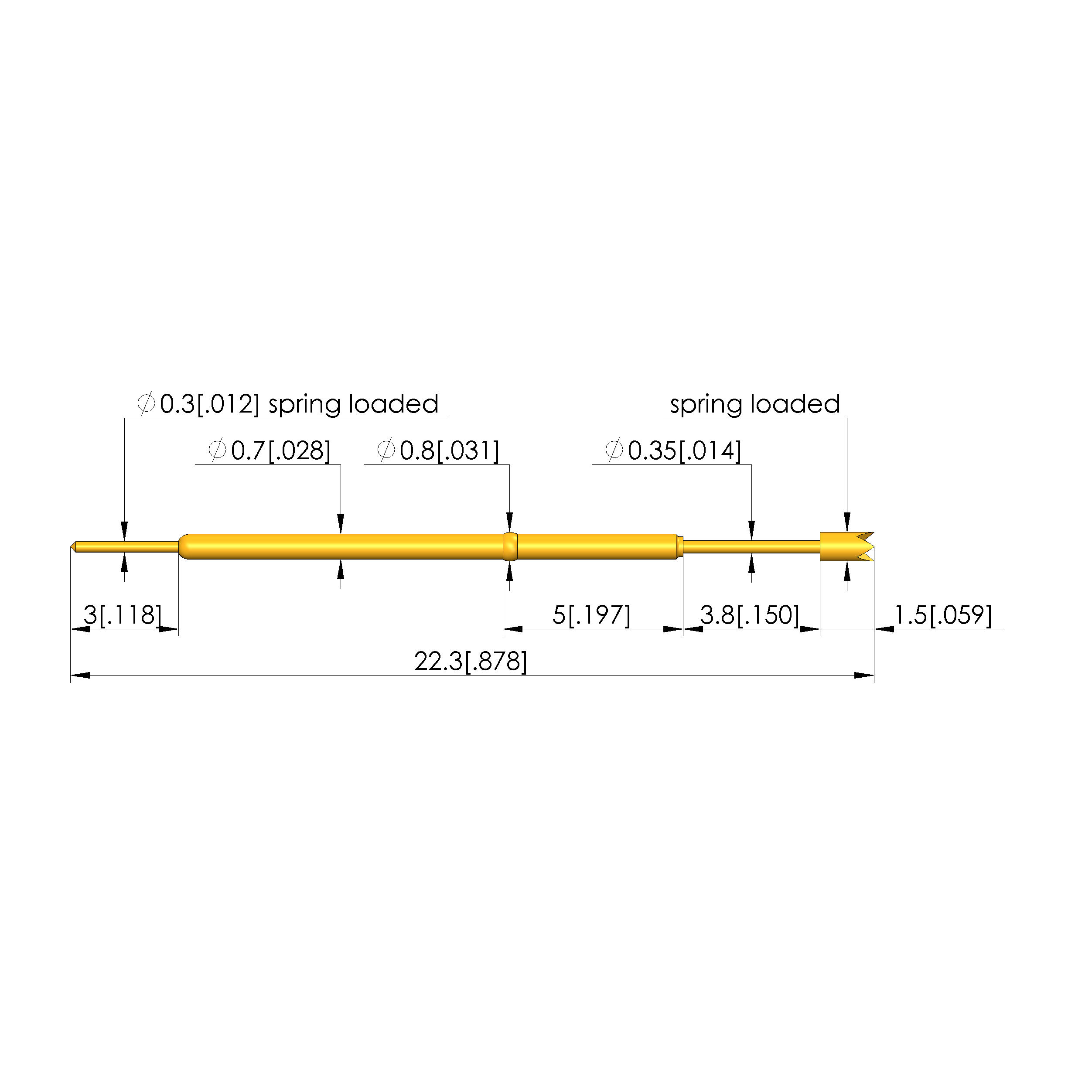 - Total length: 22.3 mm [.877 in]
