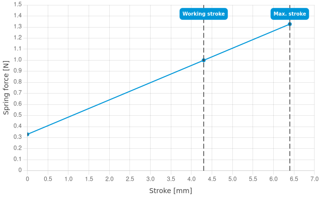 • Spring force at working stroke: 1 N [3.59 ozf]