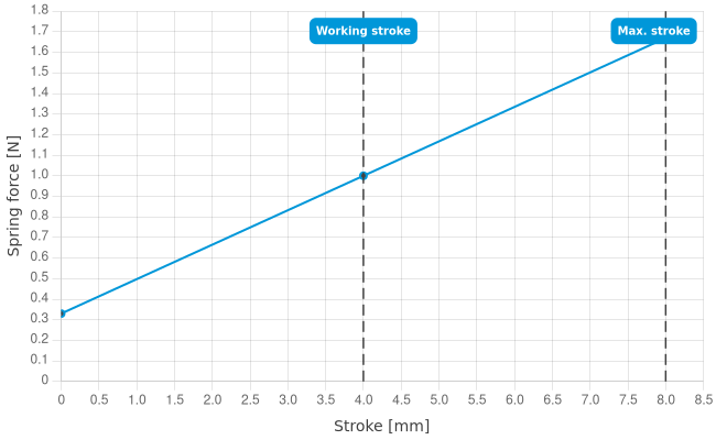• Spring force at working stroke: 1 N [3.59 ozf]