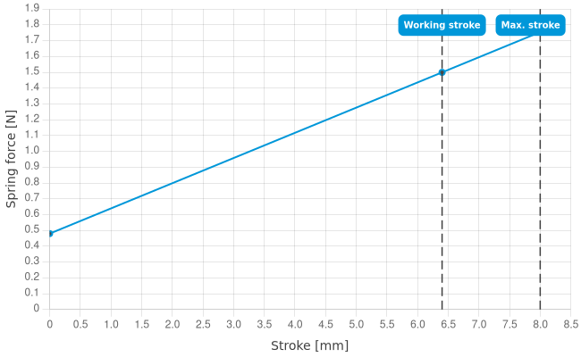 - Spring force at working stroke: 1.5 N [5.39 ozf]