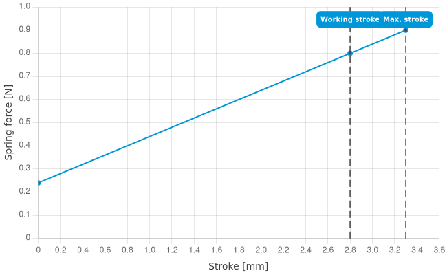- Spring force at working stroke: 0.8 N [2.87 ozf]