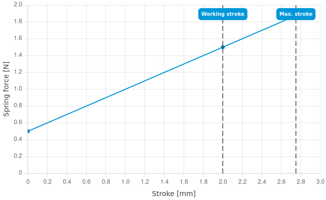 - Spring force at working stroke: 1.5 N [5.39 ozf]