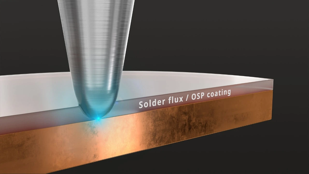 - Ideal for contacting contaminated surfaces (solder flux) or coated surfaces (e.g. OSP coating)