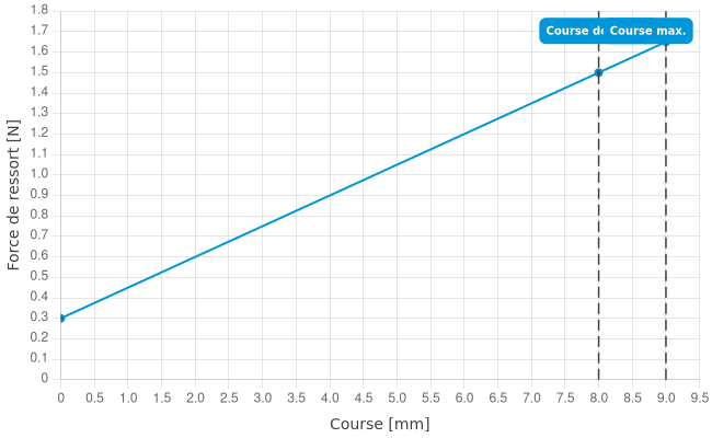 - Force de ressort en course de travail: 1,5 N