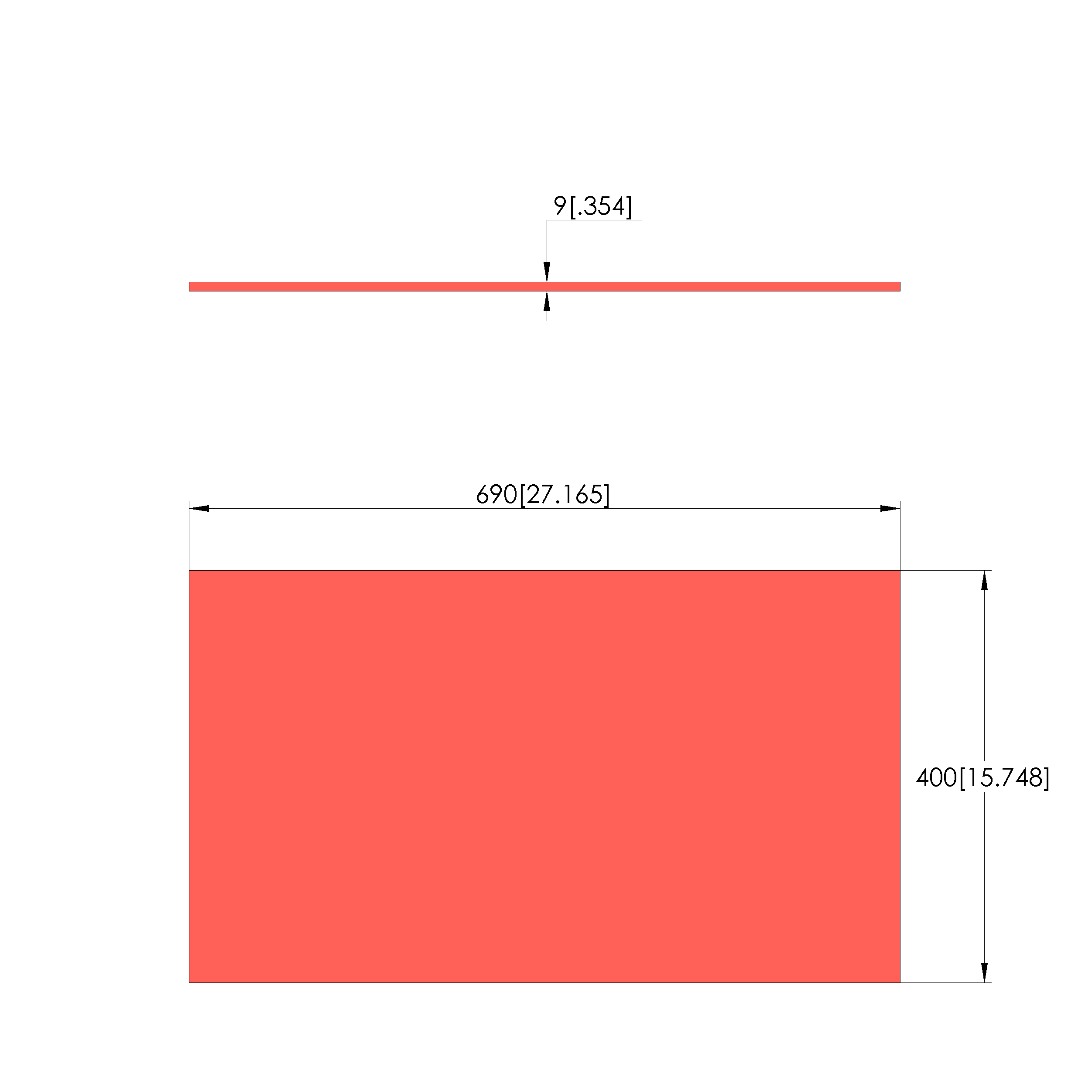 • Dimensions hors tout (LxPxH): 690 x 400 x 9 +/- 3 mm