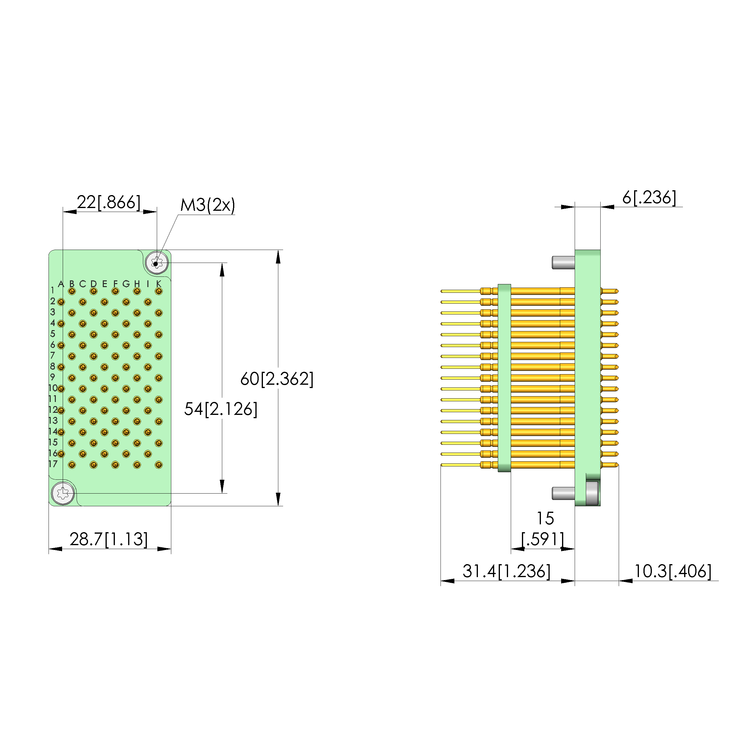 • Grandes broches Wire-Wrap alignées uniformément parallèles