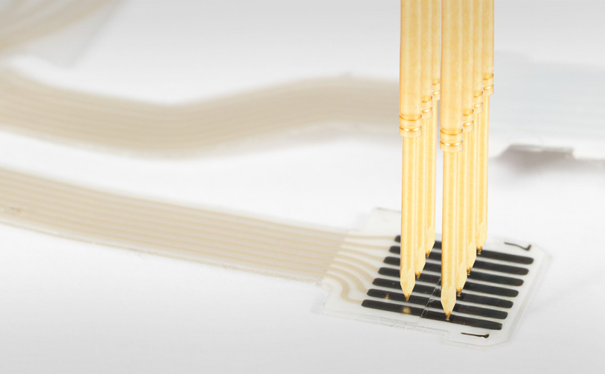 由于柔性印刷电路板具有灵活性,因此很难精确和可重复地触探测试点。由于弹簧式探针的材料厚度较低 (< 0.5 mm),因此在设计时必须确保探头能够可靠触探测试点,而不会损坏印刷电路板,尤其是不会因弹簧力过大或探头形状过硬而损坏印刷电路板。